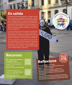 Queremos recordar que la Doctrina Social de la Iglesia (DSI) nos hace un llamamiento, como creyentes a la solidaridad en defensa del trabajo que permite a todas las personas y sus familias vivir con dignidad; y a la construcción, en comunidad, de una sociedad más justa donde cada persona aporte según sus dones. Todo un reto que nos impulsa a apoyar a las personas más vulnerables, a luchar contra las injusticias y la discriminación en el mundo del trabajo y a defender el derecho a un trabajo seguro y digno.